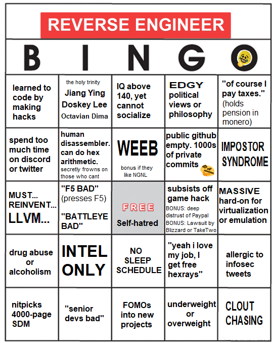 self isolation professional | hobbyist reverse engineer | full time shitposter