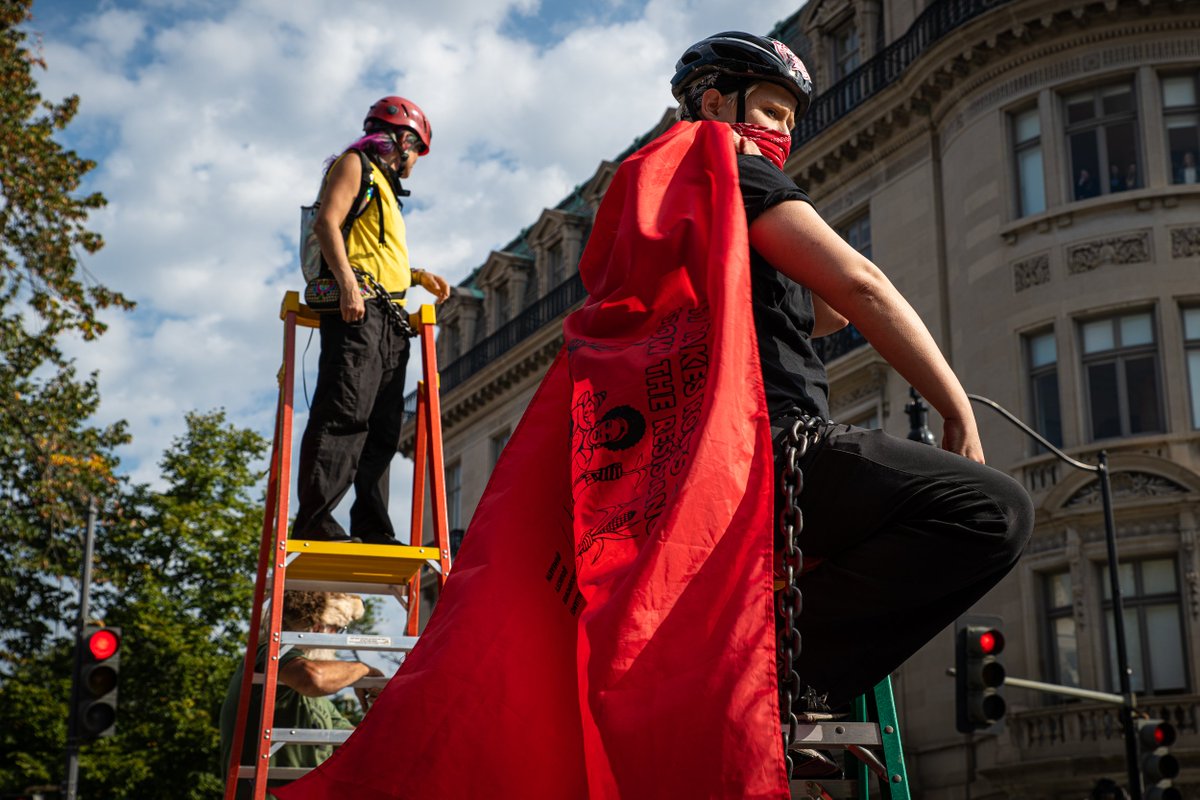 Two people have chained themselves to ladders at the intersection of Mass Ave and 18th. “Earth is on fire, the Amazon is on fire,” one yells, to an audience of workers peering out from Dupont Circle offices.