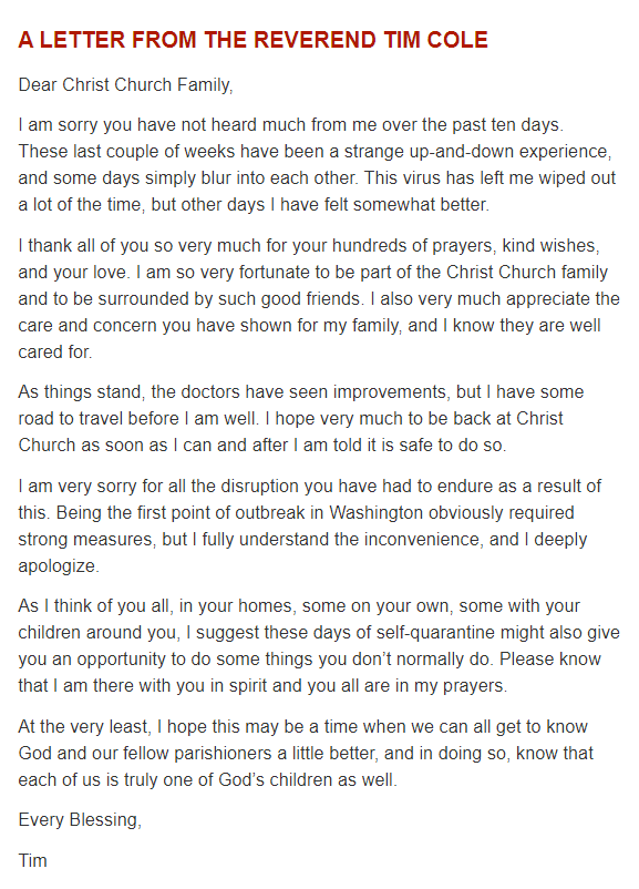 The Rev. Tim Cole, DC's first patient, wrote to Christ Church last night. "This virus has left me wiped out a lot of the time, but other days I have felt somewhat better ... the doctors have seen improvements, but I have some road to travel before I am well." #COVID19pic.twitter.com/IDhF4w7NvR