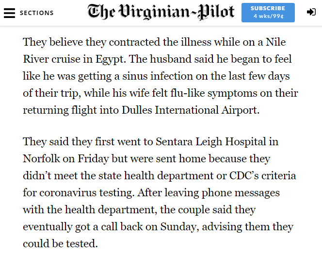 More on the Virginia Beach couple. Husband felt like he had a sinus infection on the Nile cruise, wife felt flu-like symptoms *on* the flight to Dulles. Hospital sent them home because they didn't meet test criteria. #COVID19 https://www.pilotonline.com/news/health/vp-nw-coronavirus-virginia-beach-couple-20200310-75zefmjyw5falchctgegpr2mty-story.html …pic.twitter.com/zqzkfBwts5