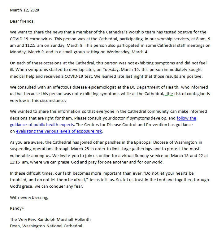 A National Cathedral team member tested positive. No clue whether this is one of the cases we know of, officials almost never get that specific outside of an elevated risk ex. Christ Church. Doesn't help that DC didn't update their data yesterday. #COVID19pic.twitter.com/C0oVgp9wsG