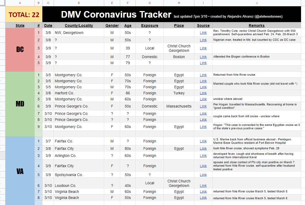 I've started a spreadsheet for coronavirus cases in the DC area (that's DC, Maryland and Virginia). Early trend: holy moly, that Nile River cruise screwed us over. Trying to keep it current—if there's something missing, ping me. https://docs.google.com/spreadsheets/d/1-dOqXayX9wAQt5XOFyQX8__2VzEVGCy5bGCEmIQuKqI/edit?usp=sharing …pic.twitter.com/MeGBfRtUkk