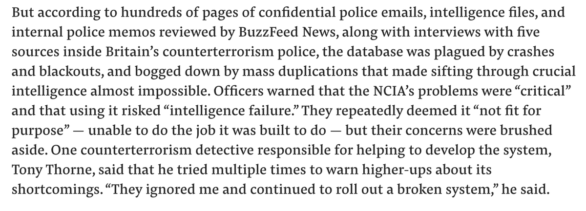 Again & again & again, UK nat'l security brass were warned that their counter-terrorism database was USELESS They rolled it out anyway—at great expense. And then came the Ariana Grande concert & one of the deadliest years in memory.