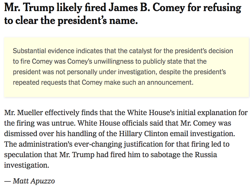 The Mueller report says there is “substantial evidence” that President Trump fired James Comey as FBI director for refusing to clear his name https://nyti.ms/2ZlVaRG pic.twitter.com/lSUFdoDKCD