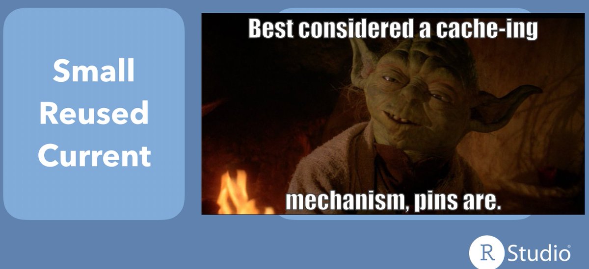 Pins (http://pins.rstudio.com ) is one of them! It's great for cache-ing things that you want to use later. It's easy to use and a great solution for saving small data frames or models.pic.twitter.com/sA0Jk0QdCm
