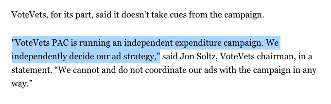 VoteVets also has a regular PAC that presumable uses a separate accounts, subject to donation limits and allowed to coordinate. But this distinction is pretty minimal in practice. The traditional PAC gets a bunch of corporate cash, by the way! https://twitter.com/alexkotch/status/1225197246624473088?s=21 …https://twitter.com/alexkotch/status/1225197246624473088 …