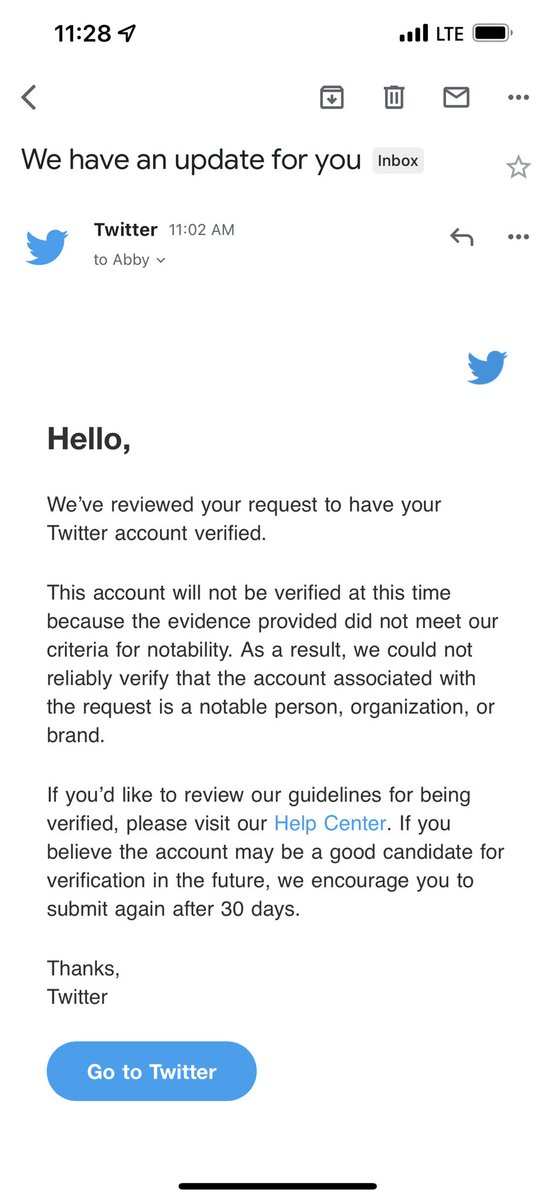 @Twitter@verified and had to submit articles about myself showing how “notable” I am. Lol. I gave them articles from NBC, ABC and FOX. I got this back 10 minutes after I applied.
