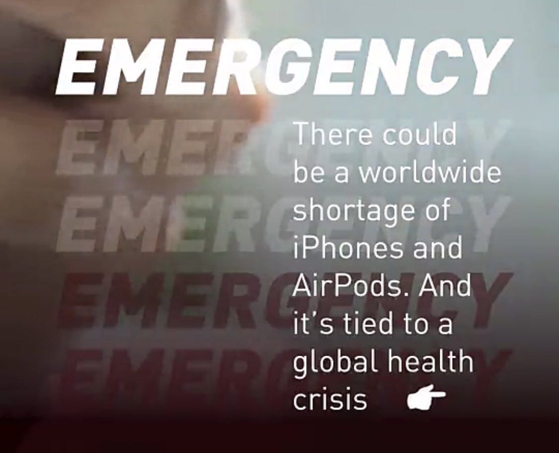 Yes! You’re right! The true emergency of the coronavirus is the worldwide shortage of iPhones and AirPods. THIS IS THE WORST THING ABOUT CORONAVIRUS BY FAR. THINK OF THE IPHONES. </sarcasm>pic.twitter.com/2r85EmRjiH