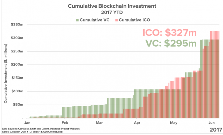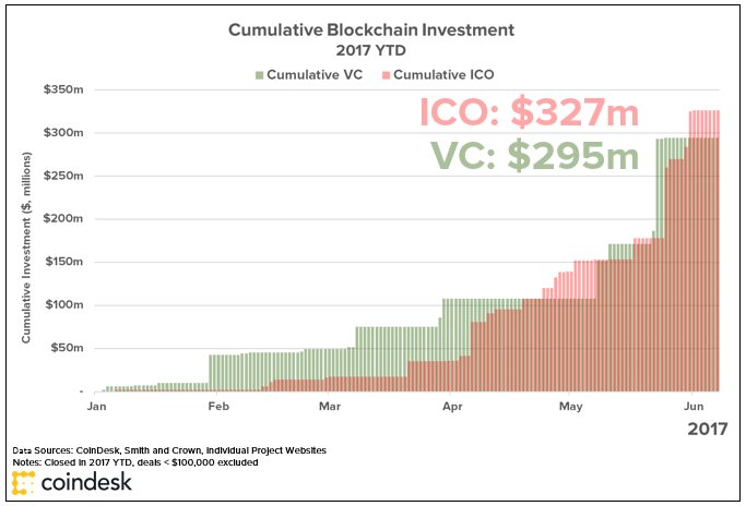 #ICO volume in 2017 now exceeds#VC in the#blockchain space - $327m to $295m