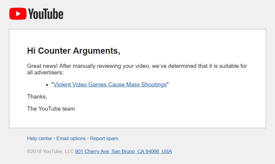 Check it out! The argument against video games causing mass shootings is now advertiser-friendly. @TeamYouTube recognized the merit/professionalism of this video and made the right call.pic.twitter.com/ZjluGu77VW