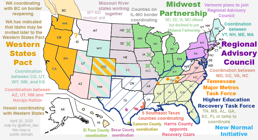 Four weeks in, the Western States Pact lobbies the federal govt for funds, the Regional Advisory Council buys supplies together. South Dakota threaten Native Americans over road closures, Indiana goes rogue, Tesla ignores the law, reopens factory in CA.https://twitter.com/alfred_twu/status/1260104838068625409 …