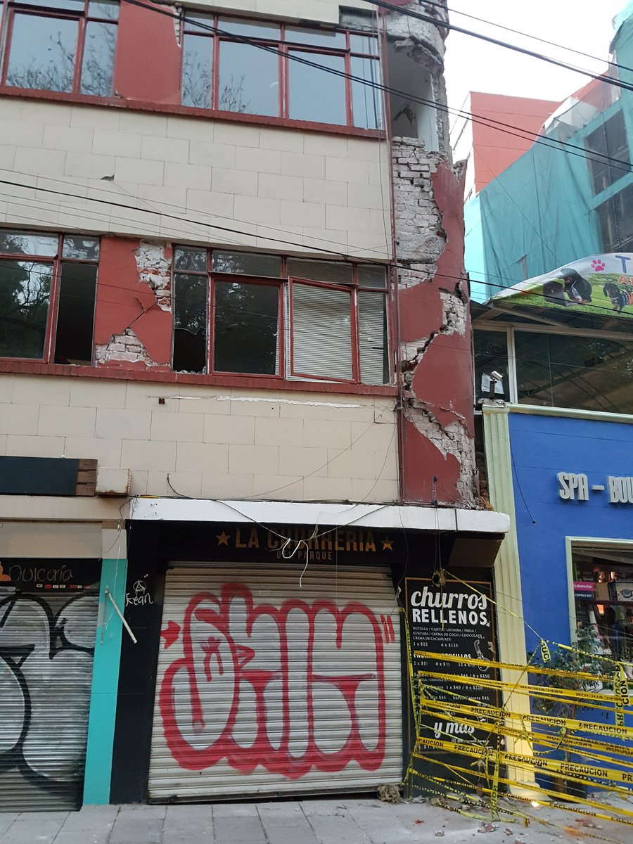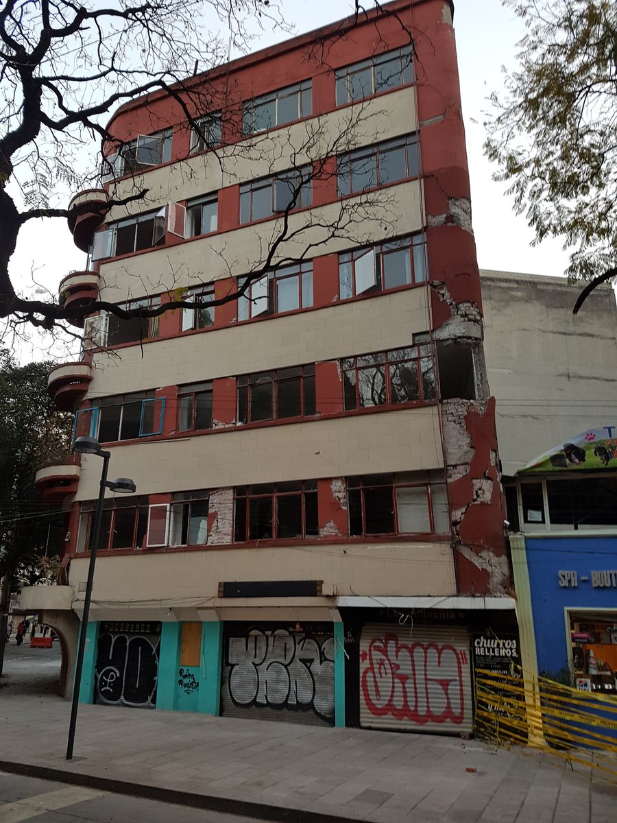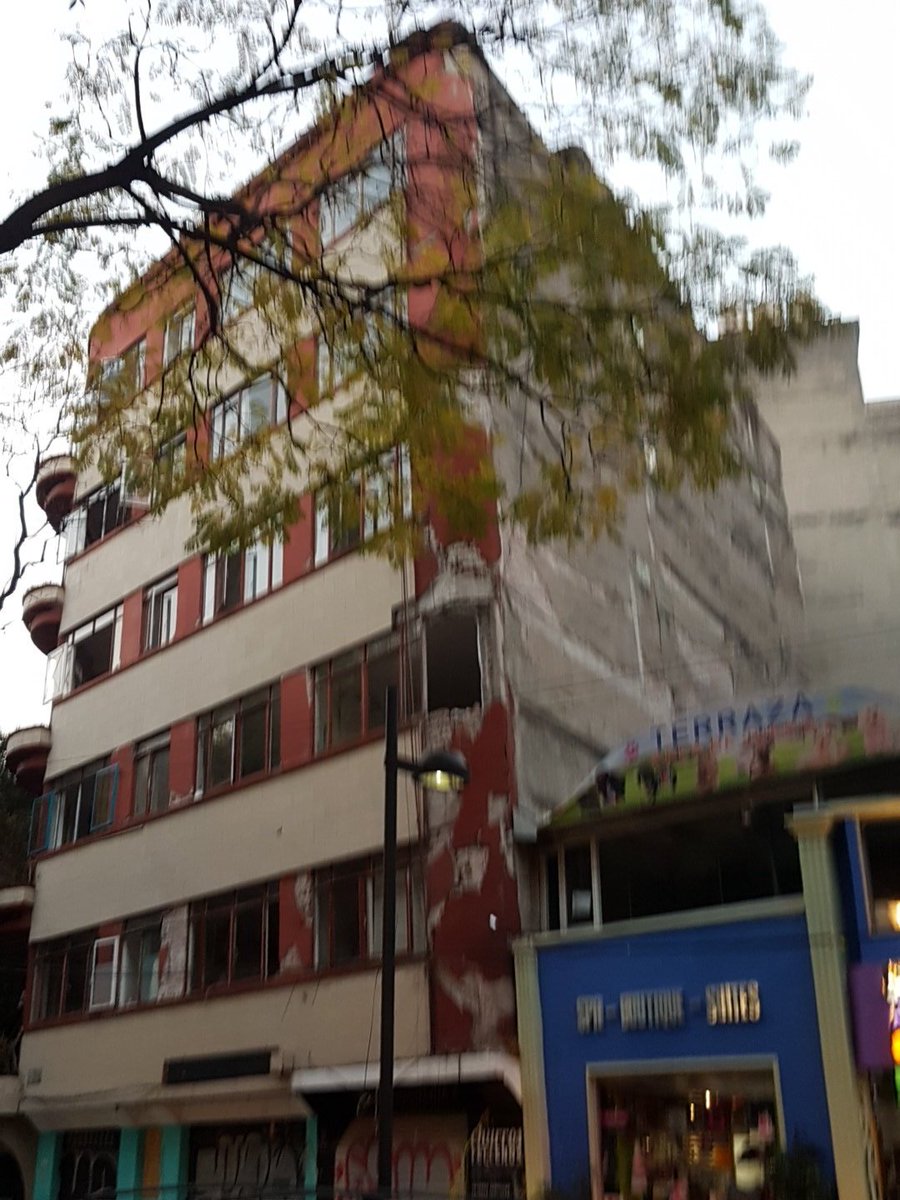 Unbelievably, this building in the La Condesa neighborhood, which was condemned after last year's#earthquake has remained standing after today's. Police nevertheless herding people away. Sirens hard throughout the city.