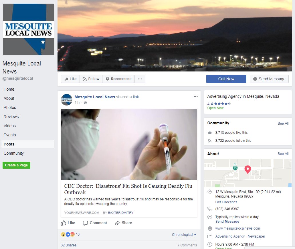 .@MesquiteLocal, a local Nevada newspaper, shared the fake YourNewsWire story about an hour ago on Facebook.pic.twitter.com/rj1vpi1HwG