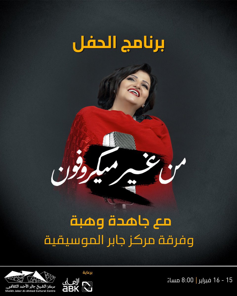 تعرف على برنامج حفل «من غير ميكروفون» مع جاهدة وهبة وفرقة مركز جابر الموسيقية ___________________ 16-15 فبراير احجز الآن http://jacc-kw.com JACC تطبيق شباك الحجز في مركز الشيخ جابر الأحمد الثقافي هذه الفعالية برعاية