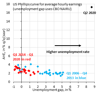 Massive layoffs due to COVID-19 caused a perverse compositional effect, as low wage job cuts caused the overall wage level to rise. To see just how bonkers this effect is, look at Q2 2020 (black), when average hourly earnings rose 17% even as unemployment was way above CBO NAIRU.pic.twitter.com/hFFLkkBv8Y