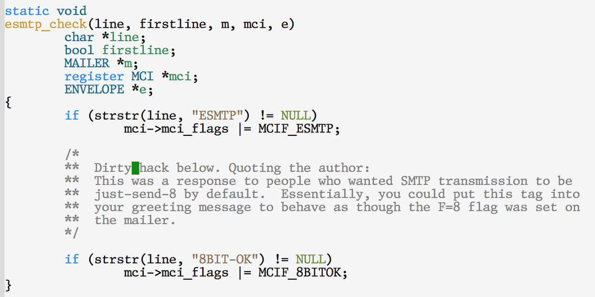 @allspaw So your#illumos example is actually sendmail: https://github.com/illumos/illumos-gate/blob/09f79f7c66b85f056db11f58210dc6182c9b1aef/usr/src/cmd/sendmail/src/usersmtp.c#L297-L303 … Not that we don't have plenty of dirty hacks, of course... -