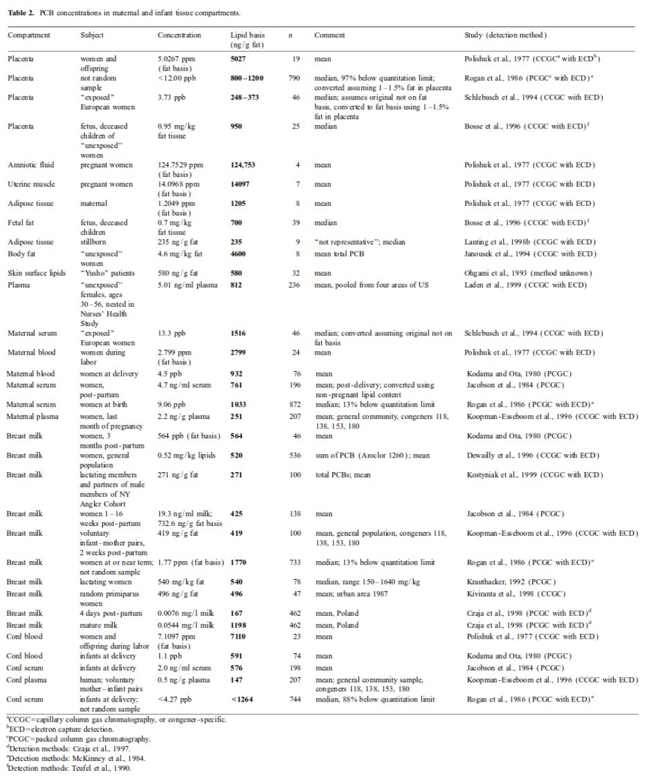I can find a LOT of studies with humans having three and four digits of ng of PCBs / g of tissue. I found a nature review from 2000 with a table where the lowest # was 147 (voluntary cord blood) and the highest was 124753 (fat basis of amniotic fluid). https://www.nature.com/articles/7500090.pdf …pic.twitter.com/EZkN5d6iEY