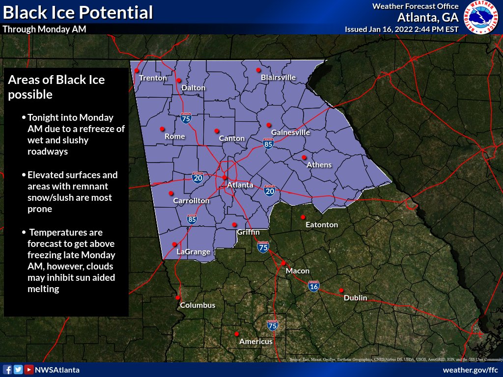 Temperatures are expected to fall below freezing tonight into early tomorrow morning. Snow and melted snow could refreeze, which would result in hazardous driving conditions, especially black ice. Georgians are being cautioned to stay off the roads tonight into tomorrow morning.pic.twitter.com/JnE9JdwofF