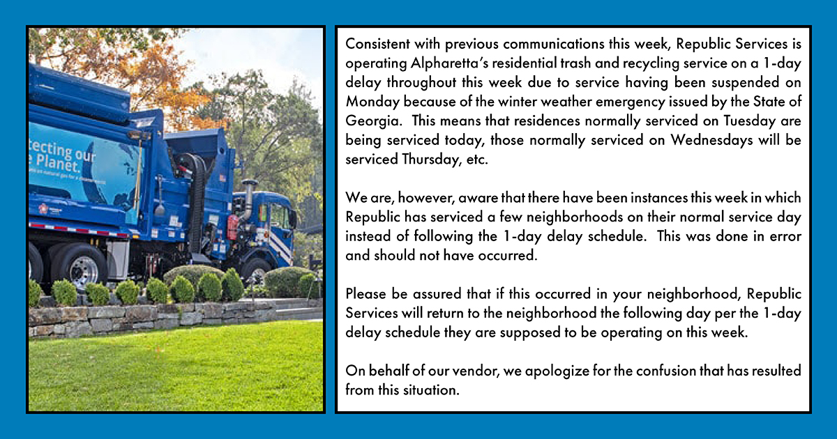 (2 of 2) Please be assured that if this occurred in your neighborhood, Republic Services will return to the neighborhood the following day per the 1-day delay schedule they are supposed to be operating on this week. https://bit.ly/3rzZn2S pic.twitter.com/5yFXVFDUYu