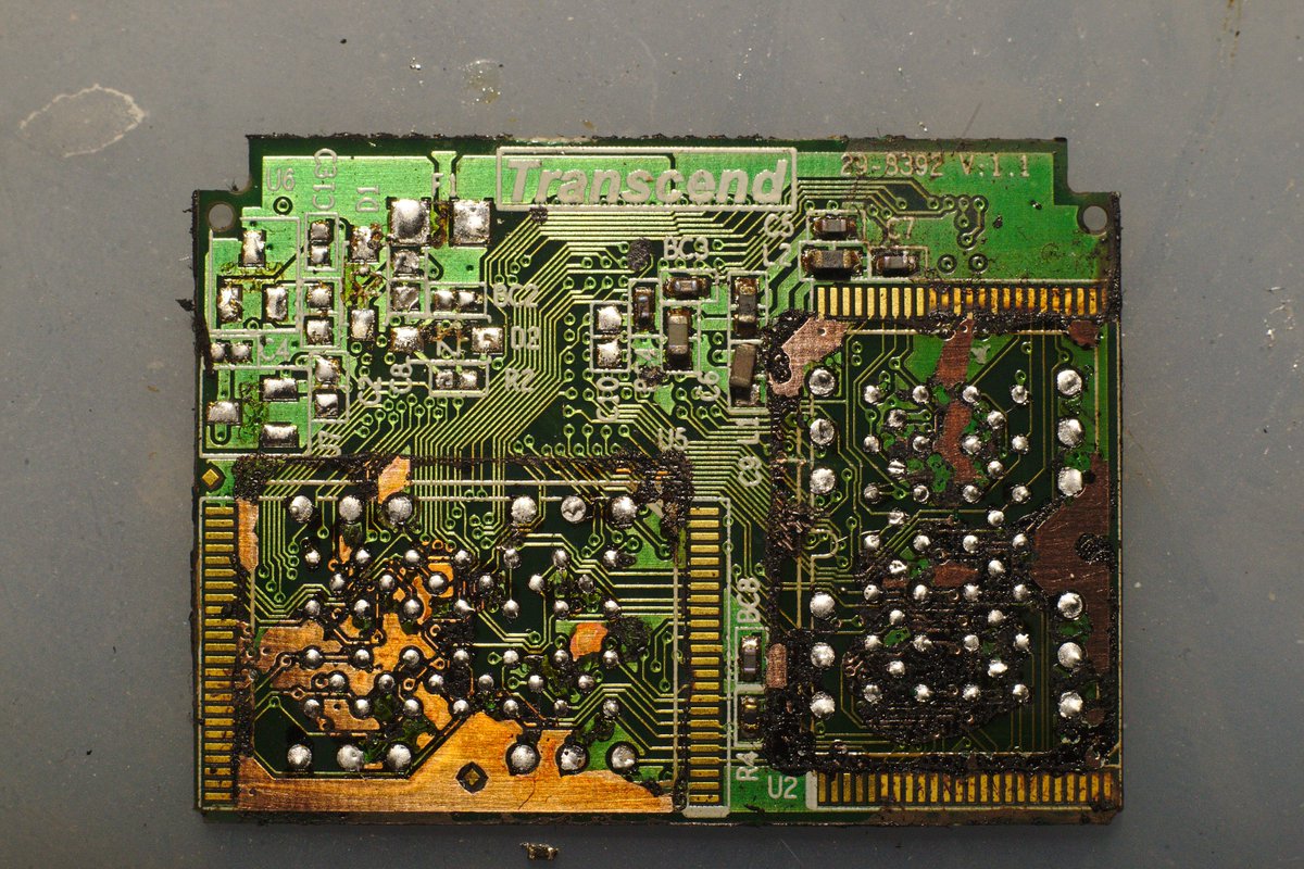 roommate brought be a CF card he dunked in coke and... I've disassembled electronics that was compounded to frustrate RE. coke. goddamn coke is better than literal epoxy or silicone potting. i tried to desolder the chips and it DELAMINATED THE PCB. never seen anything like itpic.twitter.com/ybCOH4FEoi