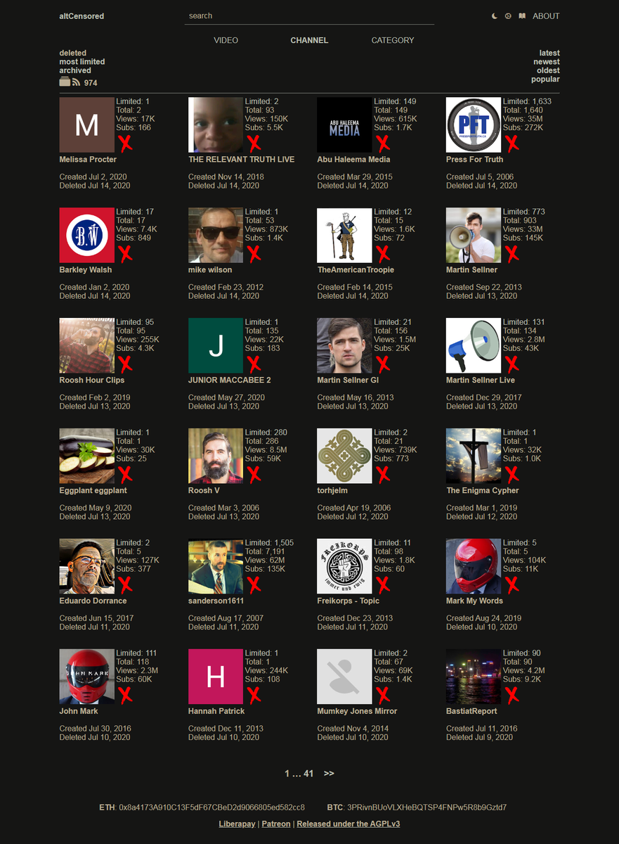 YouTube TERMINATES 90+ Channels / 10K+ Videos in 3 Weeks: 5K+ Available for Download/Sharing: "we show what they hide" (Channel RSS feeeds w/torrents facilitate downloads, Video Embeds work just like YT) #Zensur #Censorship #BigTechBias [4/4] --> https://www.altcensored.com/channel/deleted/page/4 …pic.twitter.com/CWO2zQWHh3
