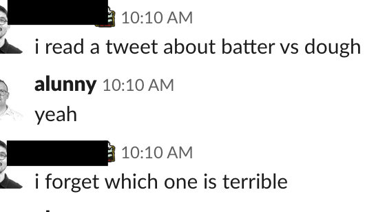 Working on a new breakfast mnemonic: Waffles with dough? Taste great to me, bro. Waffles with batter? Markedly crapper.