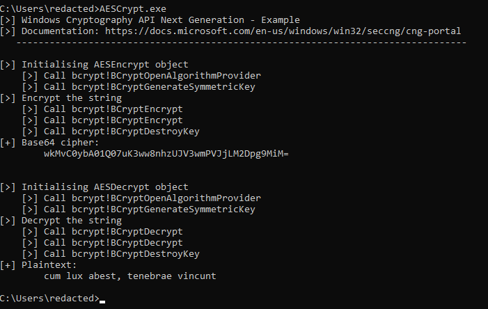 If anyone is interested by an example of the Windows Next Generation Cryptography API (bcrypt.lib) - especially after CVE-2020-0601 - I wrote a simple C++ program that encrypt and decrypt a string. Link: https://github.com/am0nsec/AESCrypt …pic.twitter.com/ZFAzVIyRsE