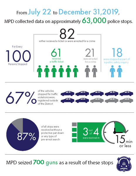 72 % of ppl stopped during reporting period were black, while 14 % were white, per report. Meanwhile, 46 % of DC's population is black while 37% is white. Does data demonstrate bias? MPD argues more data & analysis is needed. MPD partnered w/ The Lab @ DC to measure bias.