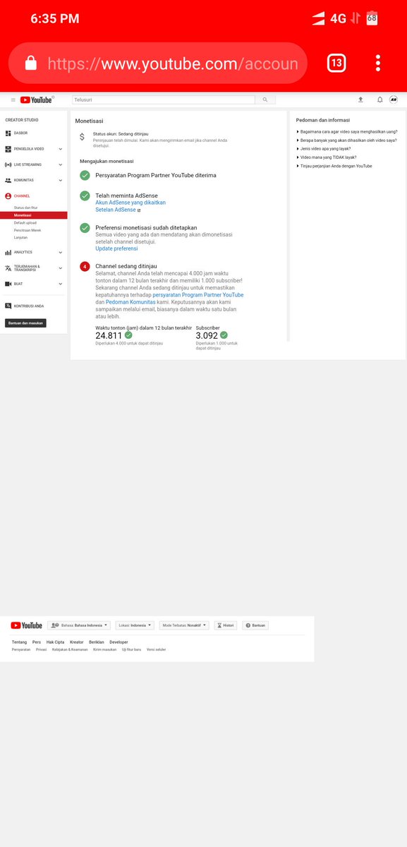 Sudah 2 bulan sejak channel saya di tinjau tapi belum ada kabar.