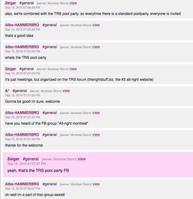 Leaked chats show a Montreal nazi network representing overlapping groups: Daily Stormer "book clubs," "pool parties" organized by fans of "The Right Stuff" (TRS) podcast, "Alt-Right Montreal" FB group, & Students For Western Civilization Toronto chapter https://www.unicornriot.ninja/2018/daily-stormer-propagandist-zeiger-exposed-as-montreal-fascist-organizer-gabriel-sohier-chaput/ …pic.twitter.com/yhNppIarOx