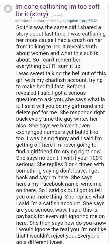 I would like to jump topics from incel power users for a moment. I will come back to it, don't worry. Today I want to talk about incels and catfishing. One of the rumoured reasons why /r/incels was banned was bc of a catfish who would film his encounters.