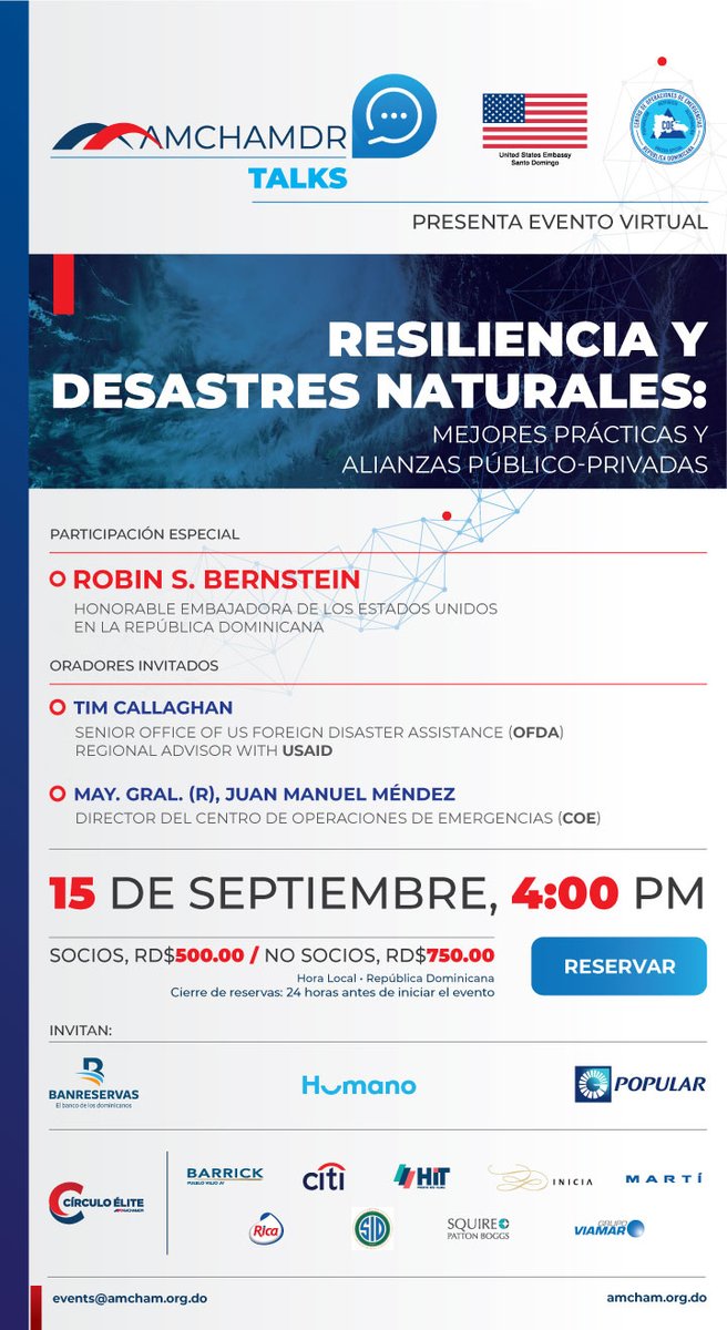 #Hoy Hablamos de “Resiliencia y Desastres Naturales” en la conferencia que tendrá al director del@COE_RD como uno de los oradores especiales. En el perfil de@AMCHAMDR está el link de registro para participar.pic.twitter.com/nDiSKk2ukB