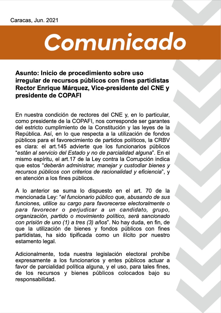 1/5 El rector Enrique Márquez da dos pasos en falso con estas desafortunadas declaraciones. El primero de ellos: habla a título personal y pretende comprometer con su gesto mediático al Consejo Nacional Electoralhttps://twitter.com/ENRIQUEMARQUEZP/status/1402257125703815171 …