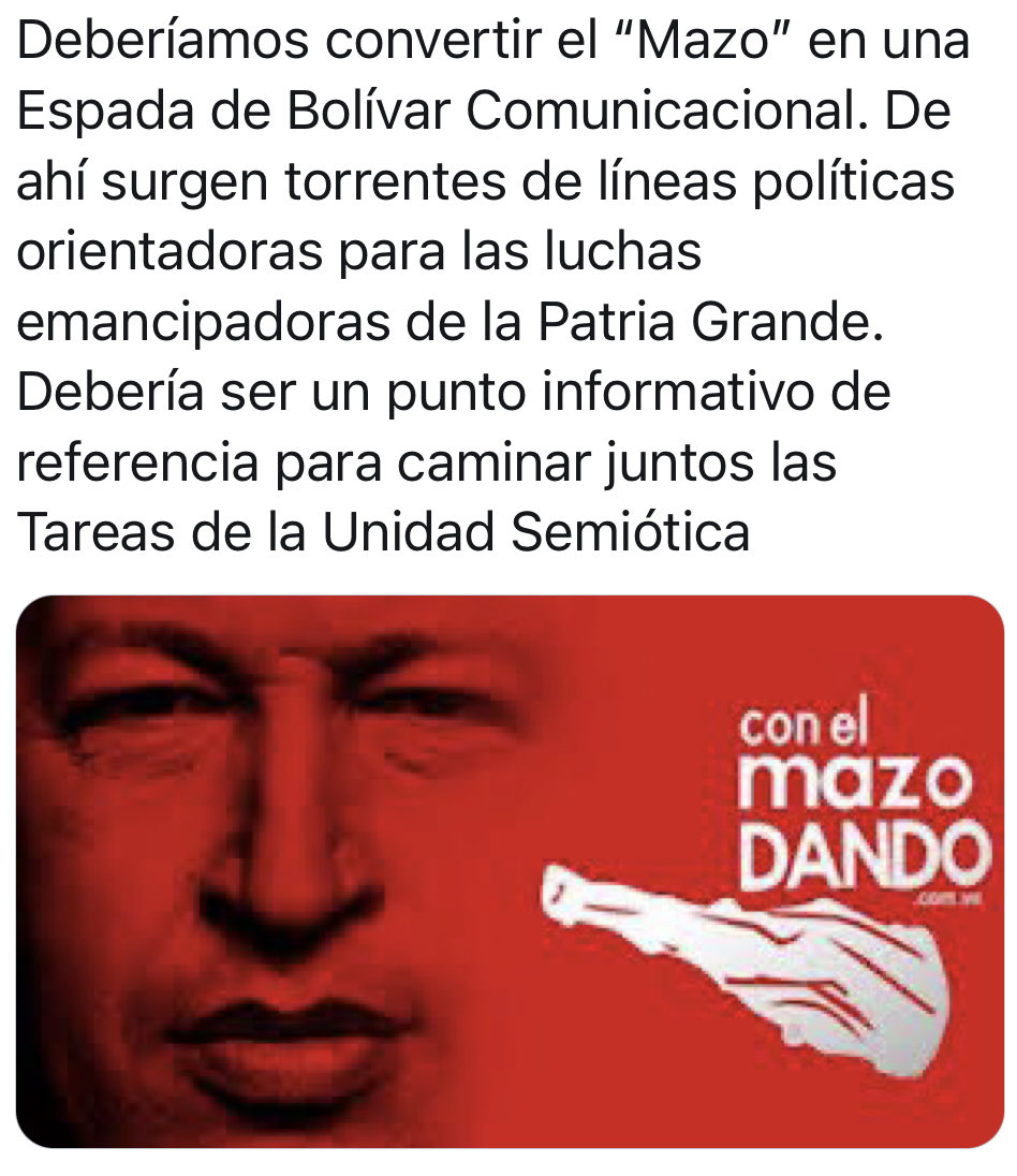 #ElMazoSiempreConChavez este programa nació en plena guerra contra la Patria, inspirado en el pensamiento, en la obra y la acción de nuestro Comandante, hoy la derecha enfila sus fuegos contra El Mazo, responderemos como siempre, con la verdad y con Chávez. Nosotros Venceremos!!Спасибо. Твиттер использует эту информацию, чтобы сделать вашу ленту лучше. ОтменитьОтменить -