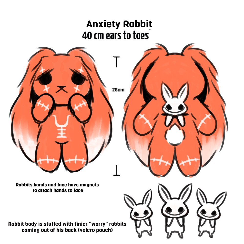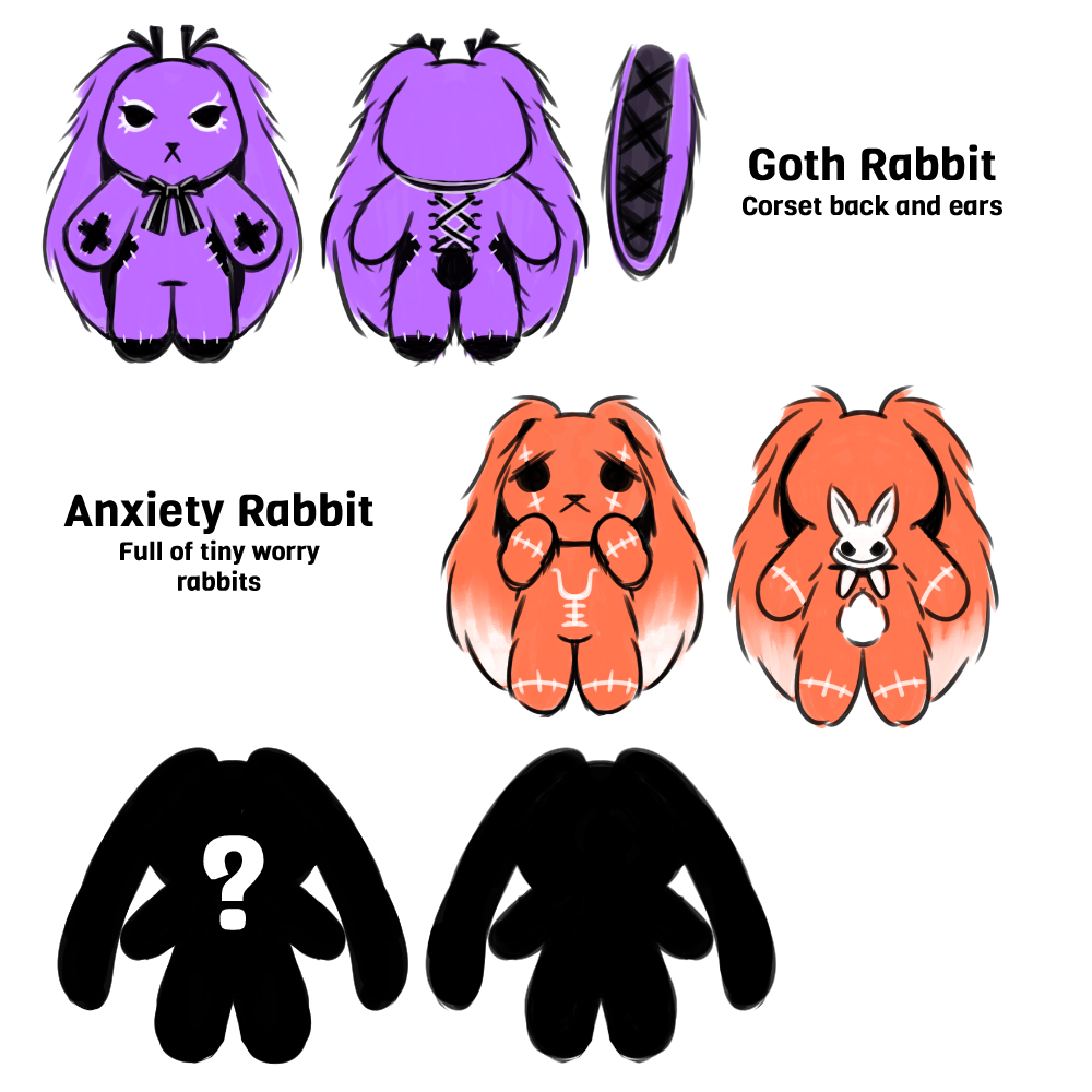 Anxiety Rabbit has a fluffle of baby Worry Rabbits you stuff into his back so he can carry them around all day. Got worries? Wish them onto the Worry Rabbits and stuff them in Anxiety Rabbit! (But don't tell PETA) Goth Rabbit... if I need to explain, you don't need to know