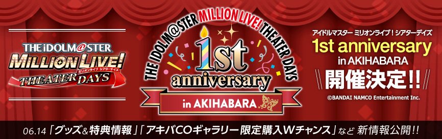 【アイドルマスター ミリオンライブ! シアターデイズ 1st anniversary in AKIHABARA】新情報を公開! ・グッズ&特典情報→http://bit.ly/2LQiD5E ・アキバCOギャラリー限定購入Wチャンス→http://bit.ly/2HOEeZR