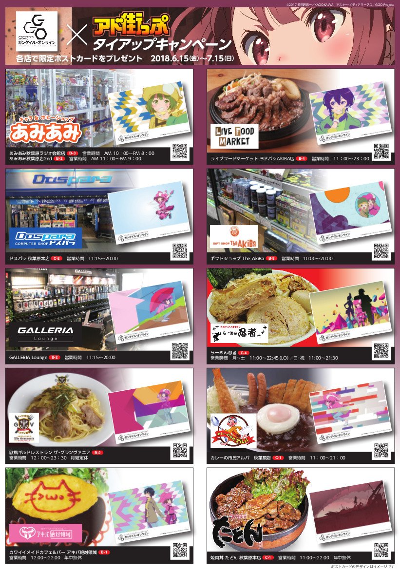 【秋葉原ラジオ会館店・秋葉原店2nd】 ソードアート・オンライン オルタナティブ ガンゲイル・オンライン×アド街っぷ タイアップキャンペーン開催☆ 6/15(金)~7/15(日)、「ソードアート・オンライン」関連商品を1,000円(税込)お買い上げ毎に「非売品ポストカード」を1枚プレゼント!