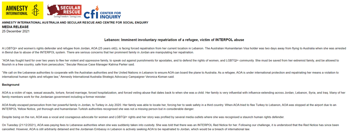 (2/2) Amnesty and our partners did not suggest AOA was being detained in Jordan's embassy in Lebanon. This latest welcome news should now clear the way for AOA to urgently travel to safety in Australia. ENDS