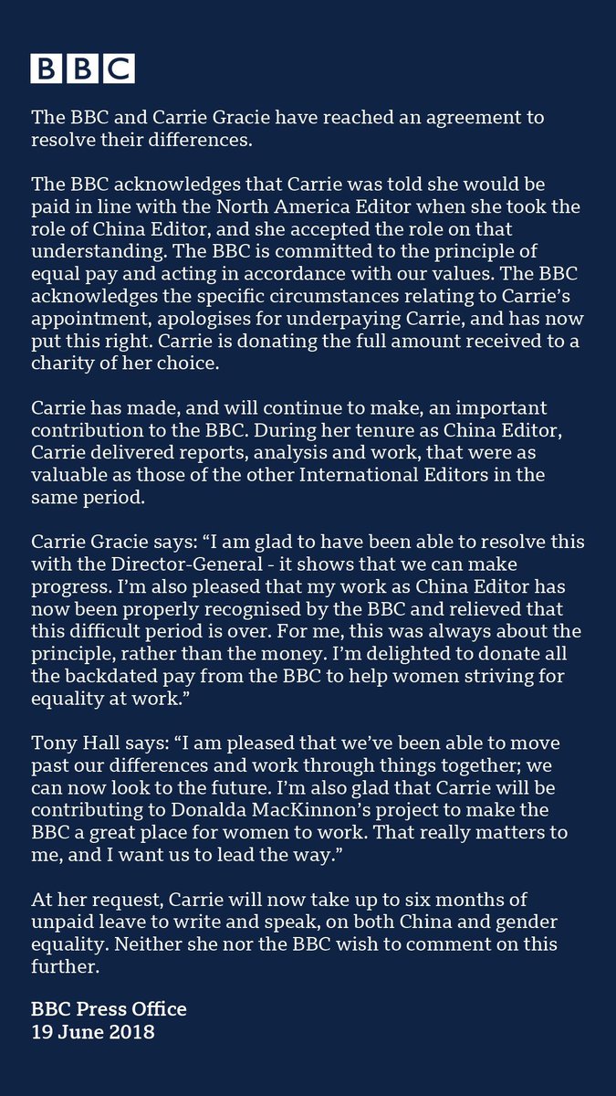 BBC and Carrie Grace release joint statement. Further statement from Gracie expected shortly. Will be on