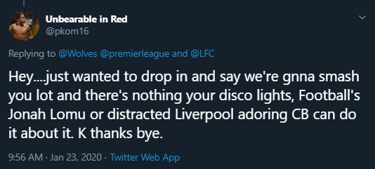 this reds fan dropped some quality banter on us before the game last night and the wolves faithful didn't properly appreciate itpic.twitter.com/bF2Db6NqmA