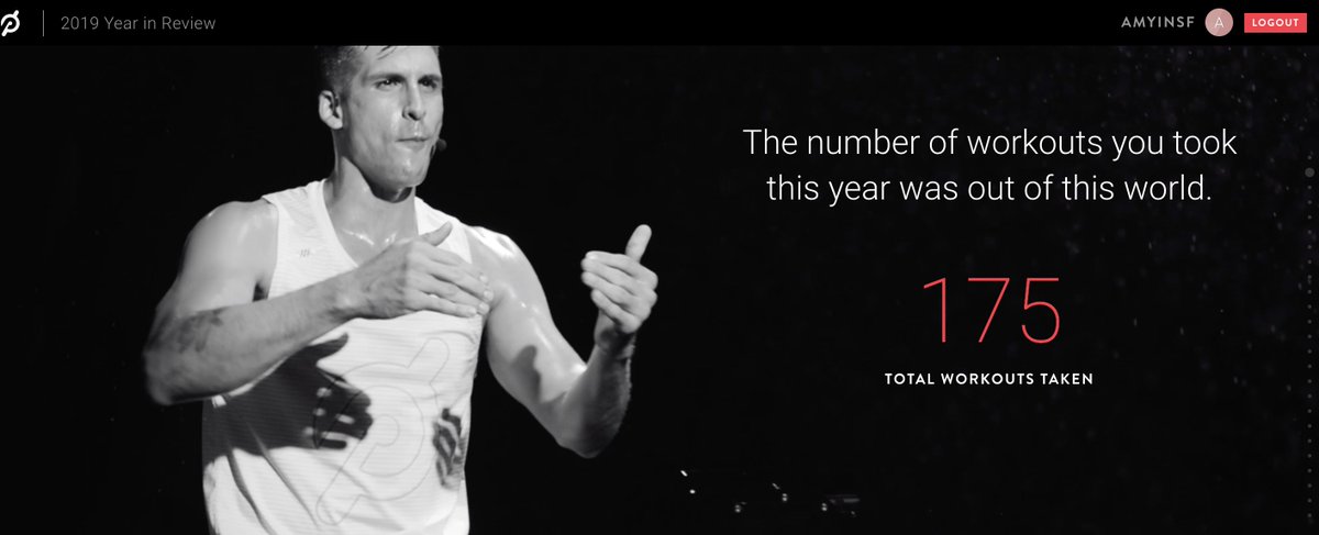 @onepeloton's Year in Review: https://yearinreview2019.onepeloton.com/ Pretty astounding that 72M workouts were completed by their members in 2019! While my 175 workouts only account for 0.00024% of that total, I'm pretty proud of that number as a new mom