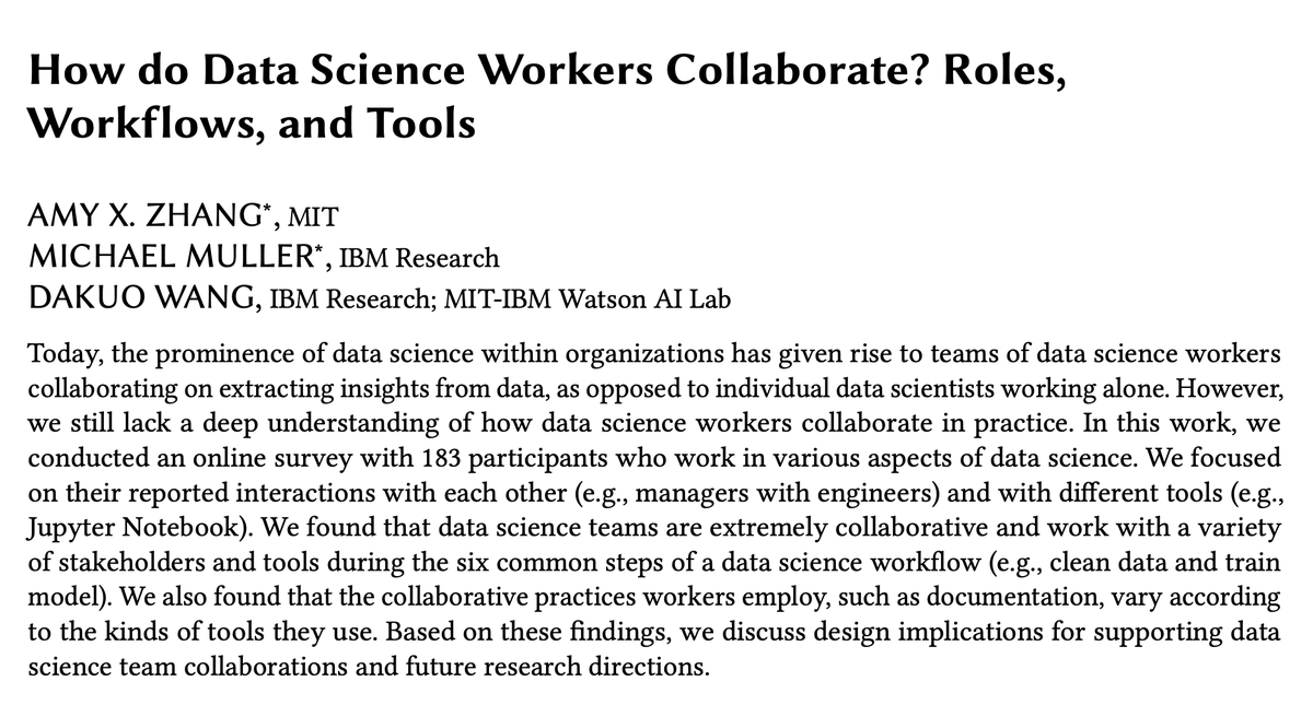 New paper at #CSCW2020 with Michael Muller and Dakuo Wang on "How do Data Science Workers Collaborate? Roles, Workflows, and Tools". We conduct a survey of industry data science/ML workers (technical and non-technical) to understand how they collaborate. https://arxiv.org/pdf/2001.06684.pdf …pic.twitter.com/0eS4Qt0fqQ