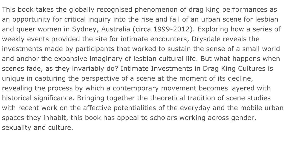 ] 'Intimate Investments in Drag King Cultures : The Rise and Fall of a Lesbian Social Scene' by @kerryndrysdale. Please contact@anadejong via email (a.dejong@surrey.ac.uk)detailing your expertise/interest to review. More info: https://www.palgrave.com/gp/book/9783030157760 …pic.twitter.com/Cr9ZbmTBab