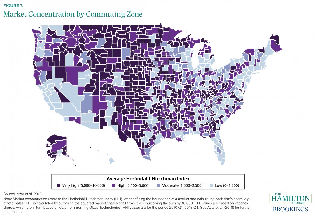 New paper via @hamiltonproj, "The State of Competition and Dynamism." Map shows labor market HHI scores -- darker purple = *less* competitive for workers. Note #ROC, #Buffalo, #Cuse have low scores, meaning ^ competition, which is good. Diverse economy. http://www.hamiltonproject.org/papers/the_state_of_competition_and_dynamism_facts_about_concentration_start_ …pic.twitter.com/c4p5qyzpmP