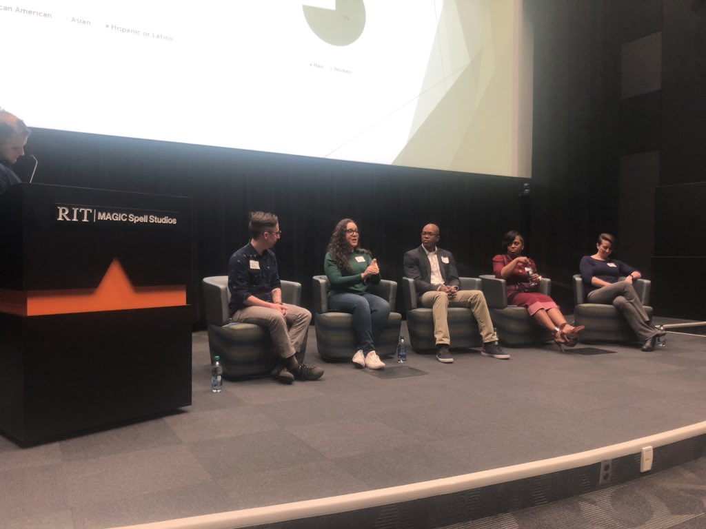 .@techrochester’s “Cultivating Inclusive Tech Communities in #ROC” is off and running at @RITMAGIC, w/ @atbrady moderating. As panelist Nathan Gibbons of @innovation_fin said, you can’t build products for people who are different from you without their perspective on your team.pic.twitter.com/D3ogHbUefH – at Magic Spell Studios