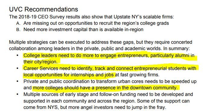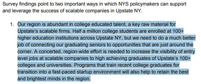 See @UVConnect's new Upstate CEO report. Reversing this must be a priority: "given that 6/10 entry-level jobs at scalable firms require a college degree and Upstate NY is home to over 100 colleges, it is surprising that only 1/2 of companies hire on campus"https://uvc.org/wp-content/uploads/2019/05/FINAL-2018-19-UPSTATE-CEO-REPORT.pdf …pic.twitter.com/sttTPrLr2Y