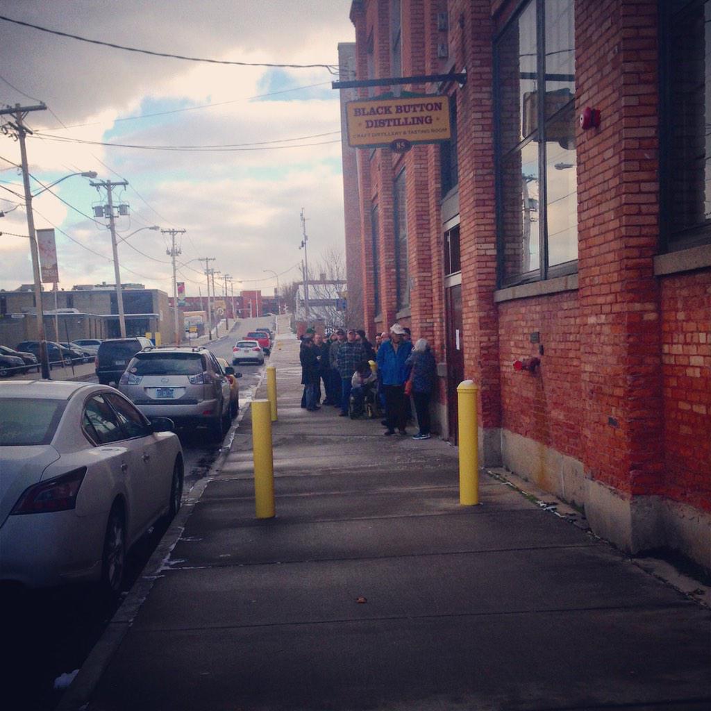 Long line outside @BlackButton85 for 1st batch of Bourbon made in #ROC since Prohibitionpic.twitter.com/6ZHnFH0aN1