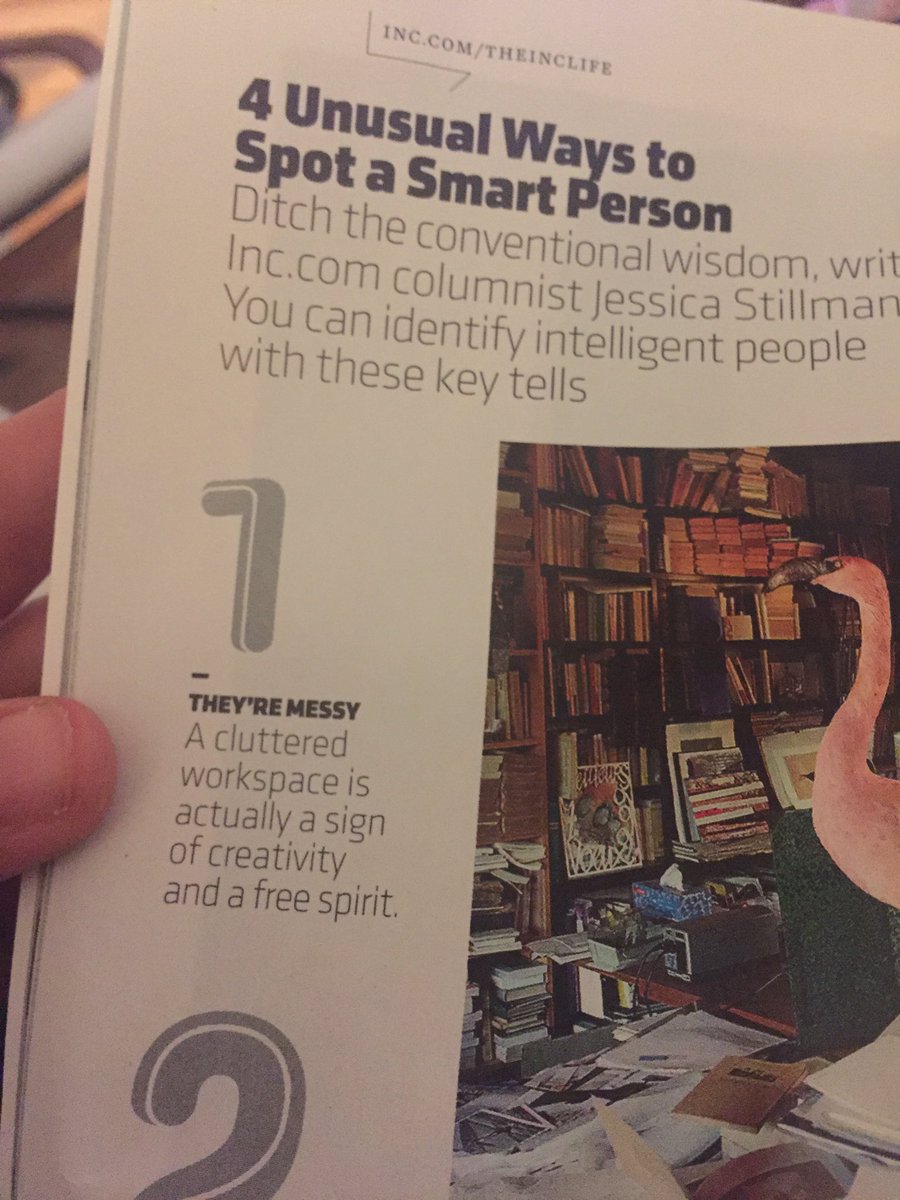 Take note! My pleasantly cluttered office is a sign of genius. @Inc October issue. On point