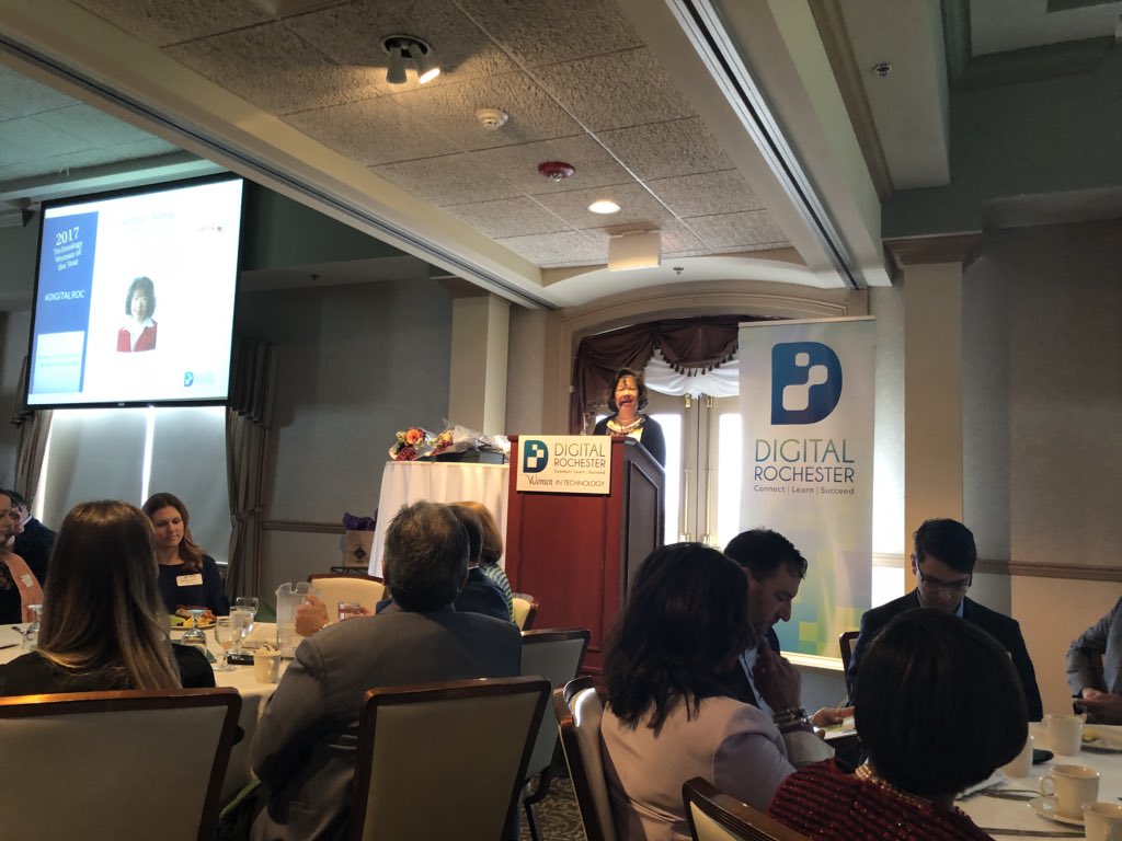 “I started out as a chemist, moved to inkjet tech, on to the business side, all the way to info security” at @Xerox says Garland. Along that journey, she said yes to every challenge and was always willing to learn. She is a @RITtigers alum. #DIGITALROC #TWY2018 @Digital_Roch