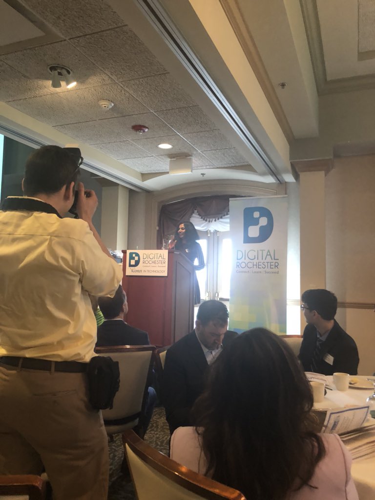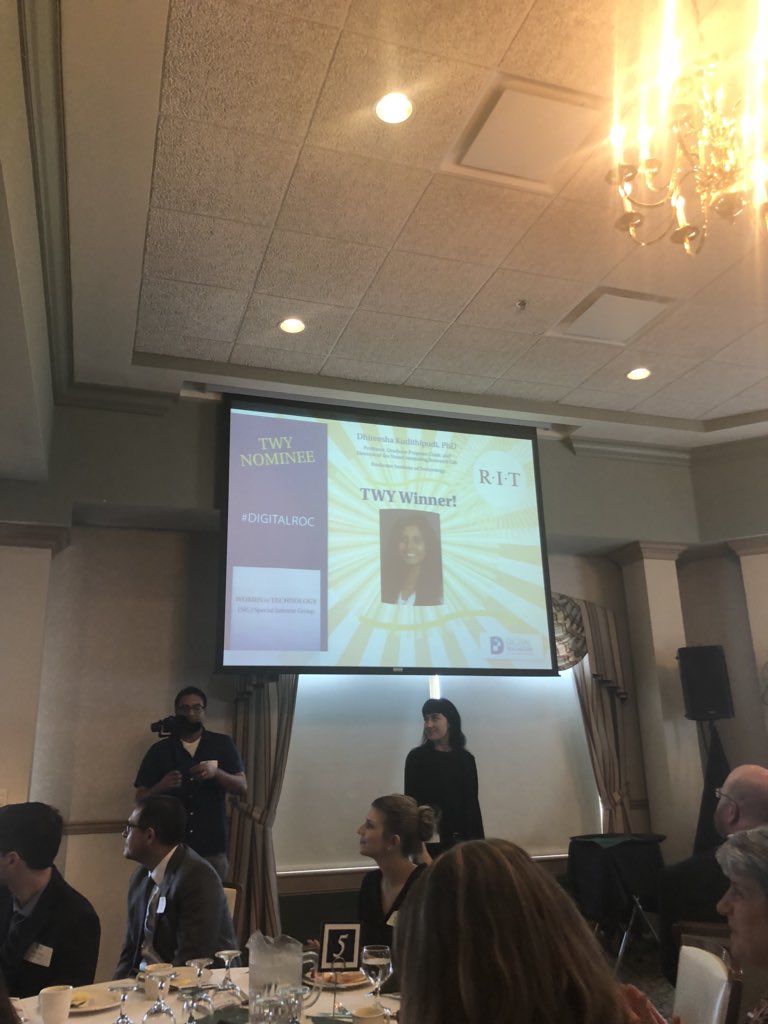 Dr. Dhireesha Kudithipudi, Prof., Grad. Program Chair, & Dir. of @RITtigers NanoComputing Research Lab accepts @Digital_Roch #TWI2018 recognition, dedicating the honor to students and family, & stating her hope that the innovation developed in her lab can “serve as an equalizer.”pic.twitter.com/mF3ik3pfJo